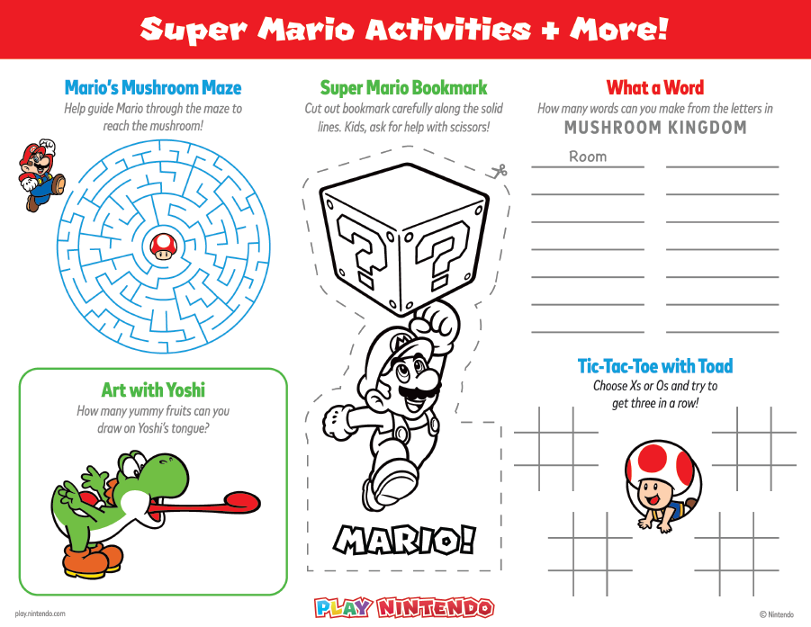 Mario, Yoshi, and Toad bring the fun and smiles with a printable Super Mario activity sheet + bookmark craft. You can enjoy a maze, tic-tac-toe, a spot to draw art, and more. The printable sheet also includes a bookmark! You can download the file, then open the file on your computer to print.