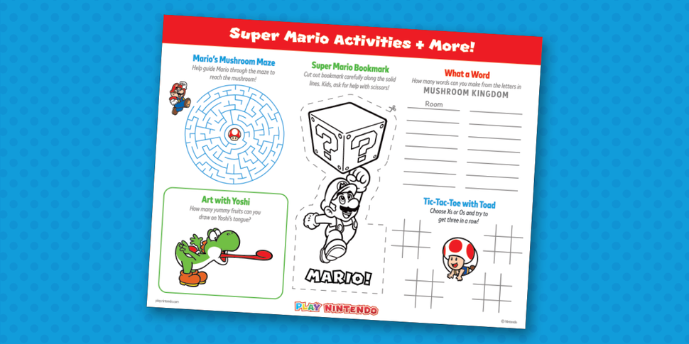 Mario, Yoshi, and Toad bring the fun and smiles with a printable Super Mario activity sheet + bookmark craft. You can enjoy a maze, tic-tac-toe, a spot to draw art, and more. The printable sheet also includes a bookmark! You can download the file, then open the file on your computer to print.
