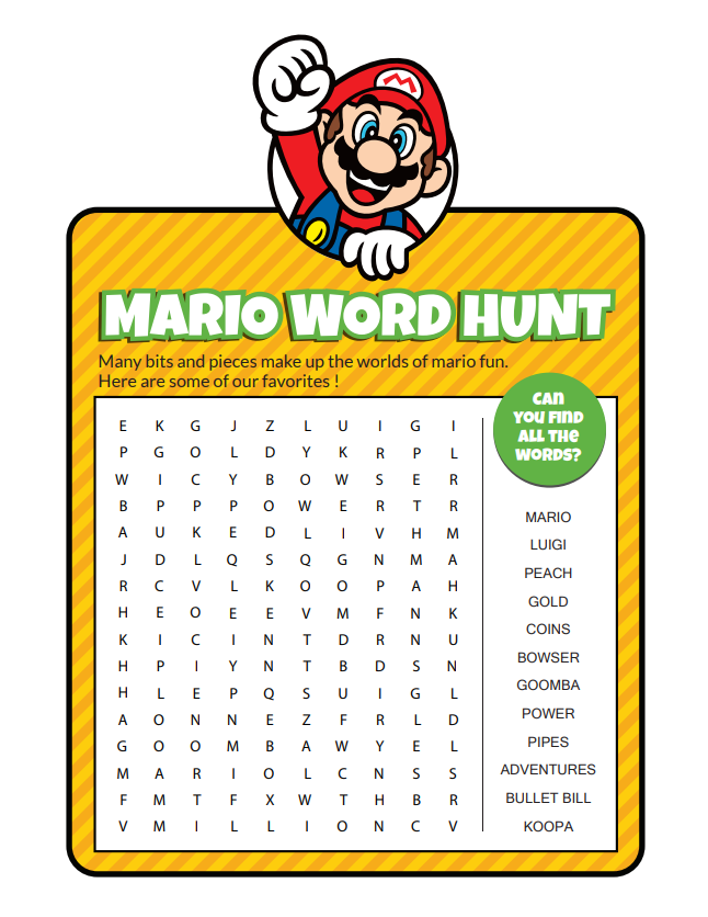 Many fun words from the world of Mario are hiding in this jumble of letters. You can download this PDF, print it and find them all!